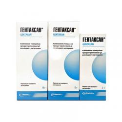 ГЕНТАКСАН® – комбінований антимікробний препарат пролонгованої дії для місцевого застосування, що містить аміноглікозид гентаміцину сульфат, кремнійорганічний сорбентполіметилсилоксан (метоксан) і сполуку цинку з триптофаном. Гентаміцину сульфат – антибіотик широкого спектра дії з бактерицидним ефектом, активний відносно патогенних грампозитивних мікроорганізмів: Staphylococcus aureus, streptococcus, Mycobacterium spp. і грамнегативних мікрорганізмів: Pseudomonas aeruginosa, Aerobacter aeruginosa, Escherichia coli, Proteus spp., Klebsiella spp., Serratia spp., Shigella spp., Salmonella spp., Citrobacter spp., Providenta spp., Yersinia spp. Поліметилсилоксан забезпечує сорбційно-дезінтоксикаційні властивості та разом з цинктриптофаном потенціює антибактеріальні ефекти антибіотика та підтримує протимікробну концентрацію антибіотика в рані на терапевтичному рівні протягом 8 діб. Аплікаційна терапія препаратом ГЕНТАКСАН® знижує на 2–3-тю добу кількість мікроорганізмів у рані до мінімального рівня (102–103 в